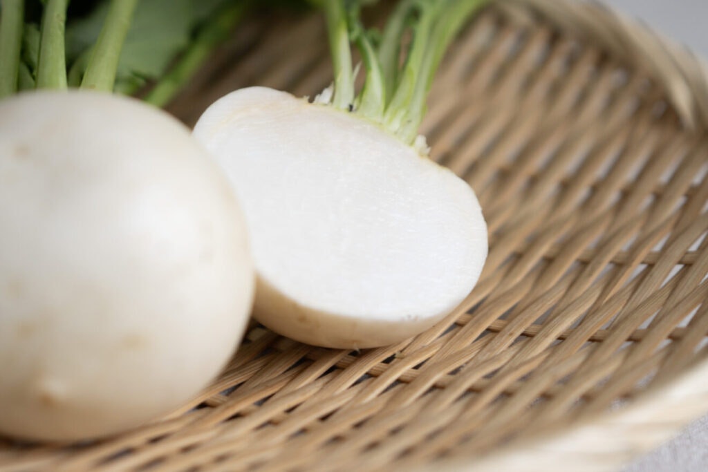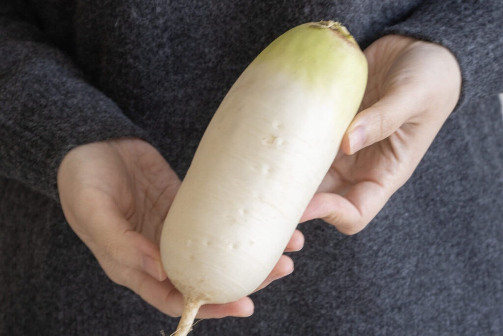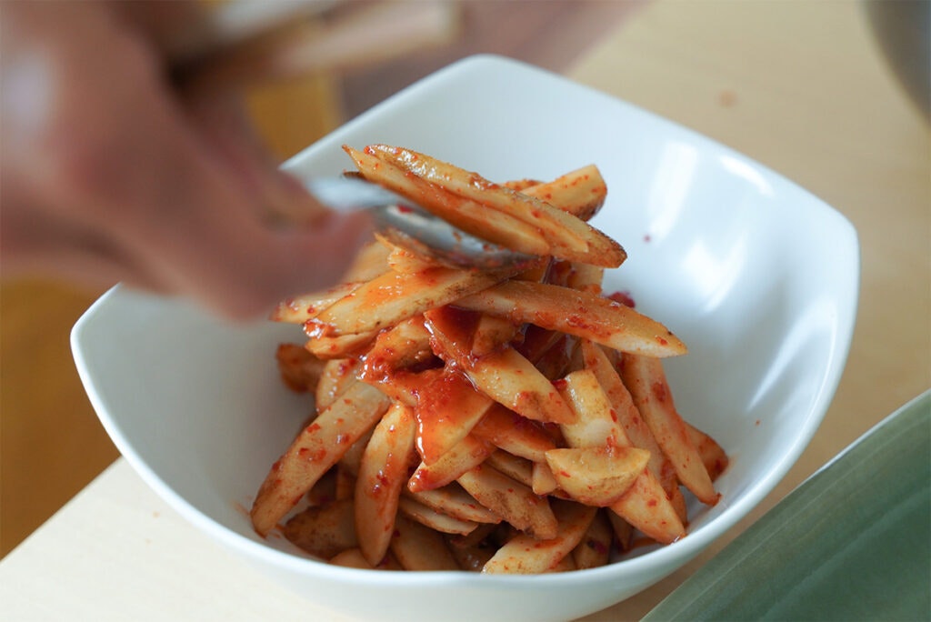 葉っぱに近いほど甘く、先になるほど辛みが増すだいこん。使う部分によって違った味わいを楽しめます。パリッと歯ごたえのよいキムチをどうぞ。