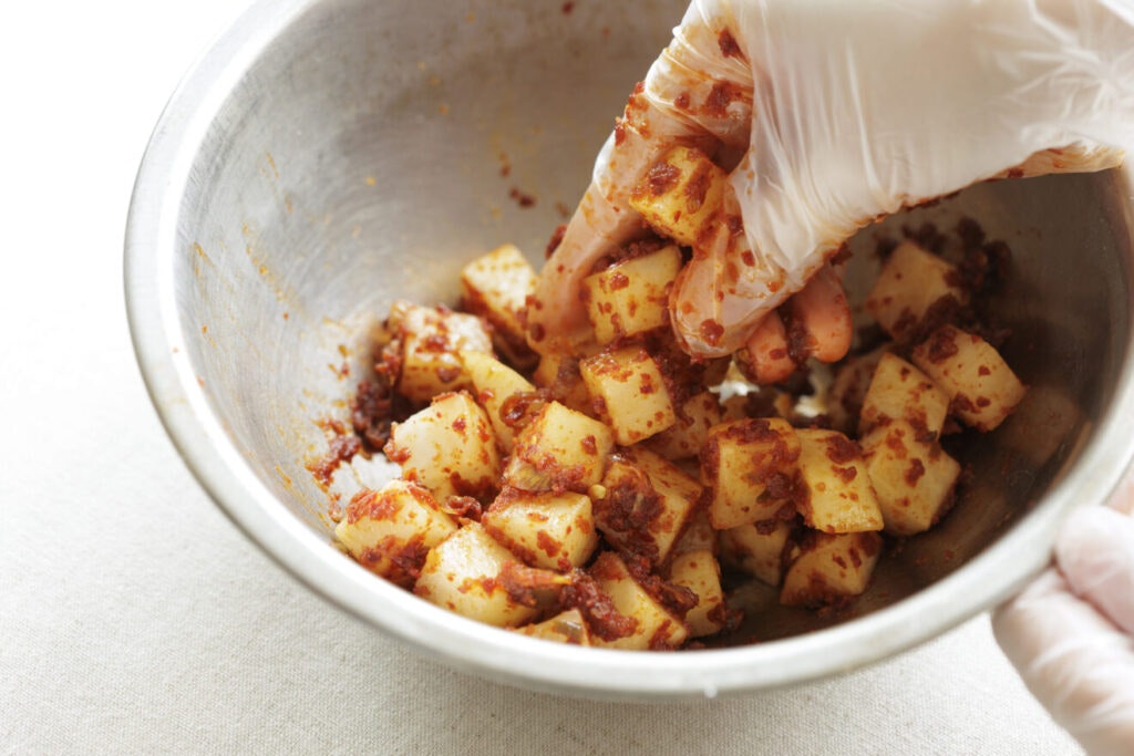 5)漬かりムラがないように、お野菜全体にヤンニョムを揉みこみます。