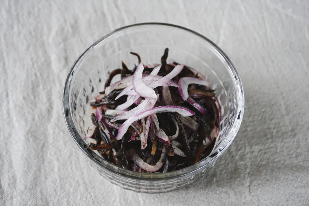 とろりと柔らかい赤玉ねぎに、ごま油のいい香り。梅酢がまろやかなに酸味に仕上げてくれます。
