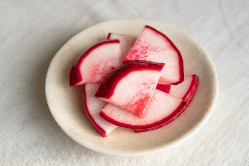 ピンク色がきれいな赤かぶを、やさしい甘酸っぱさの浅漬けに。かぶのみずみずしさが際立ちます。