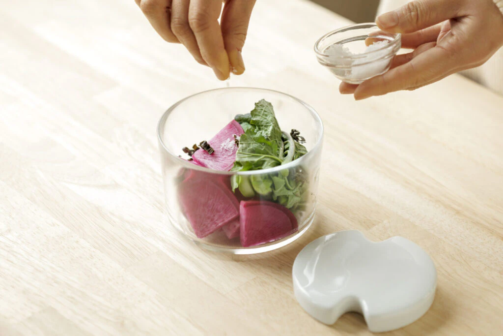 ambaiの浅漬器は、ガラス製の器と磁器の重しがセットになっているので、切ったお野菜を入れて塩をふるだけで、手軽に浅漬けがつくれます。