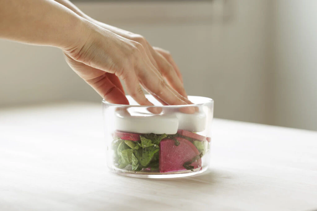 浅漬けを手軽に食卓へ。重しつきのシンプルな浅漬器