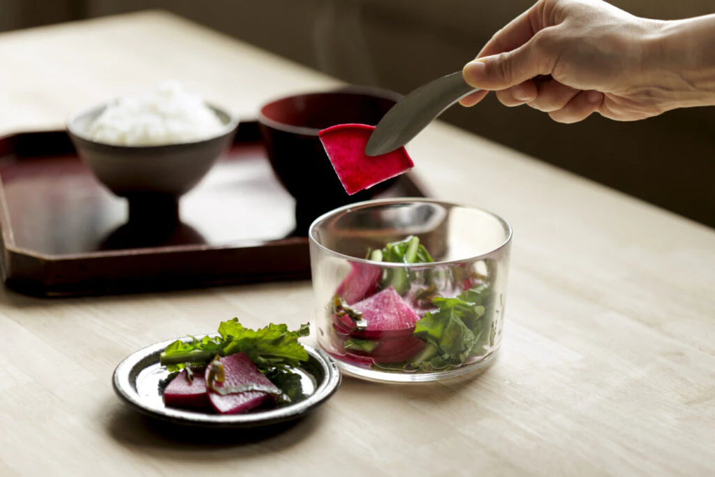 浅漬けができたら、器ごとテーブルへ。シンプルで落ち着いたデザインは、日々の食卓にすっとなじみます。丸みのある形なので、洗いやすいのもうれしいポイント。
