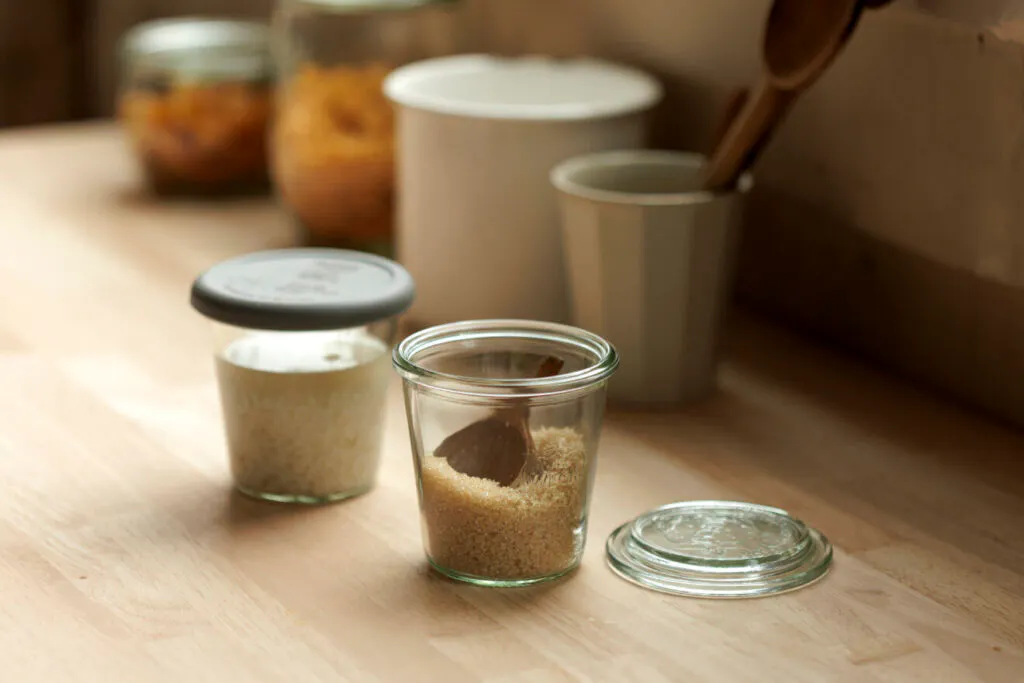 口が広く取り出しやすいので、調味料入れにも。片手でふたを開けられるので、お料理中にもさっと調味料を取り出せます。2個セットなので、塩や砂糖を入れて、キッチンに並べておくのもいいですね。