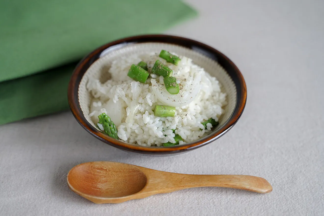 アスパラと新玉ねぎのみずみずしさを味わえる炊き込みご飯。
