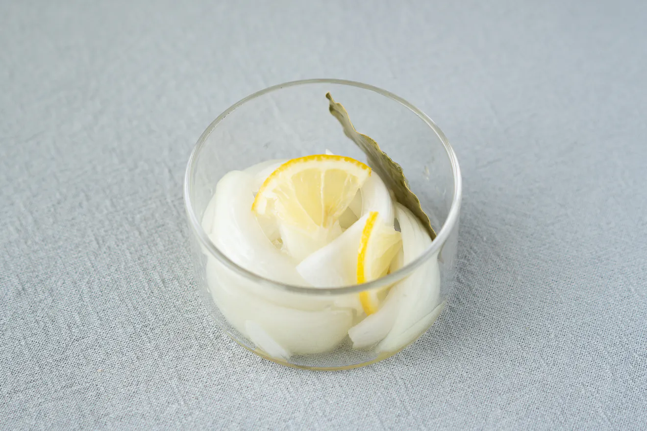 新玉ねぎのみずみずしい甘みが引き立つピクルス。レモンの色と香りがさわやかです。