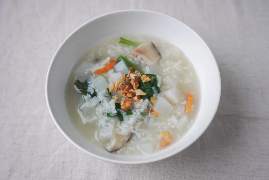 お粥のやさしい味わいに、エビとしいたけの旨みをプラスしました。体がほっと温まります。