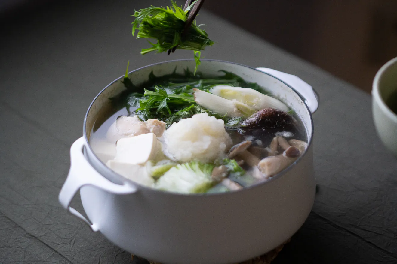 大根おろしをどん、と入れたみぞれ鍋。甘みとうまみのきいた、大根と塩麹のおだしを味わいましょう。